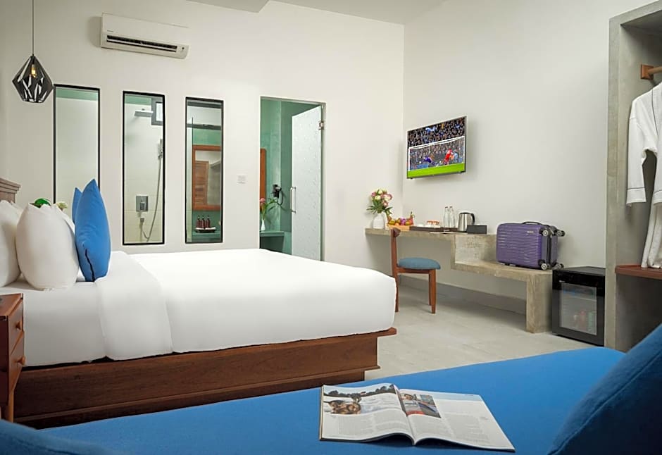 The spacious double room offers air conditioning, soundproof walls, a balcony with pool views as well as a private bathroom featuring a walk-in shower.